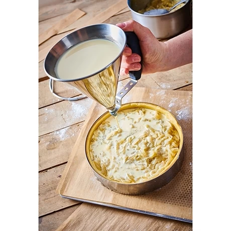 L’entonnoir à piston Kwik De Buyer permet de verser et décorer vos préparations avec un geste sûr, précis et simple. Une fois le liquide rempli dans l’entonnoir, une gâchette vous servira à libérer le liquide d’une seule pression de l’index : appuyez, dressez, relâchez. Les liquides froids et chauds jusqu’à 80°C peuvent être utilisés dans cet entonnoir, vous permettant de remplir vos liqueurs, cocktails et autres boissons, de faire vos crèmes et verrines couches après couches ou de verser vos sauces sur vos plats. Vous pouvez également décorer vos assiettes grâce à son manche ergonomique et son contrôle de débit.