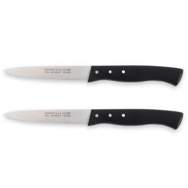 Ce lot comporte deux couteaux d’office 9 cm Nogent Gamme Expert. Ce set de couteaux garantit une qualité de coupe exceptionnelle grâce à sa véritable finition de coupe Affidenté ® avec une denture de 4 dents au mm pour des performances professionnelles : confort d’une lame affilée lisse et durée d’un tranchant denté garanti sans affûtage. Lame épaisse meulée en biseau, sur toute la largeur. Acier inoxydable 18/8, écroui 3 : triple rivetage en inox. Manche ergonomique en polypropylène surmoulé, garanti indémanchable et antibactérien au lave-vaisselle.