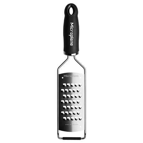 Utilisées à travers les cuisines du monde entier, les râpes Microplane ont révolutionné leur domaine avec un outil dérivé de la menuiserie aux performances bien plus fiables qu’une râpe traditionnelle. Pour diversifier les utilisations de leurs râpes, Microplane a lancé une gamme d’outils spécialisés, dont cette râpe à fromage Extra grossier Gourmet noire Microplane. Avec une lame en acier inoxydable découpée par photochimie, ce qui lui garantit une résistance accrue puisqu’elle est faite d’une seule pièce, cette râpe est équipée de trous très larges par rapport à la râpe Premium Classic qui s’adaptera parfaitement pour les découpes de pommes de terre, carottes, noix de coco, choux et fruits. Coleslaws, juliennes, copeaux larges de parmesan, ses bords aiguisés râperont facilement de gros morceaux.