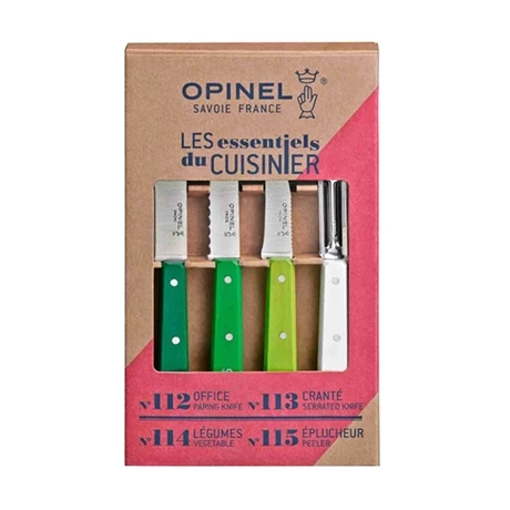 Le coffret Les Essentiels Primavera regroupe les 4 couteaux indispensables à avoir en cuisine. Un couteau d’office, un couteau cranté, un couteau à légumes et un couteau éplucheur. Chaque couteau a un manche en bois de charme lasuré dans les tons verts.