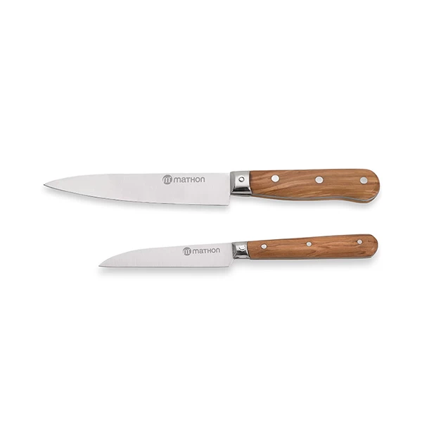 Ce set de la marque Mathon est constitué d’un couteau d’office et d’un couteau de chef, qui sont les 2 couteaux incontournables en cuisine. Grâce à ce set, vous disposerez des 2 couteaux les plus polyvalents, ils sont parfaits pour débuter en cuisine car ils vous permettront de tout faire.